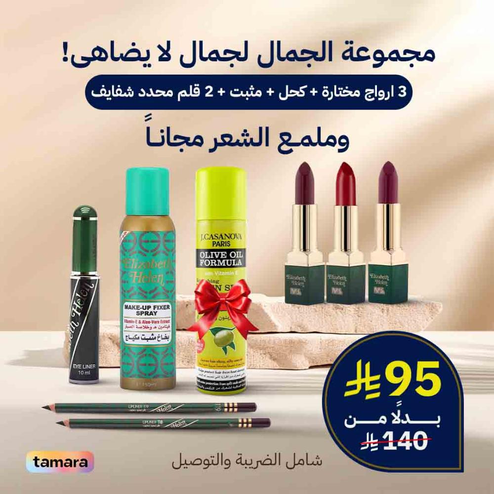 احصلي على مظهر متكامل مع مجموعة الجمال هذه المجموعة تضم 5 منتجات تجميل مميزة تناسب كافة احتياجاتك، بالإضافة إلى هدية مجانية لتعزز مظهرك.